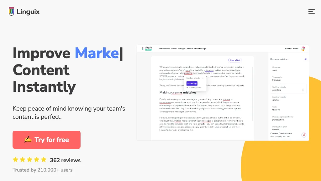 Linguix is a writing tool that offers free grammar check and assists users in improving...